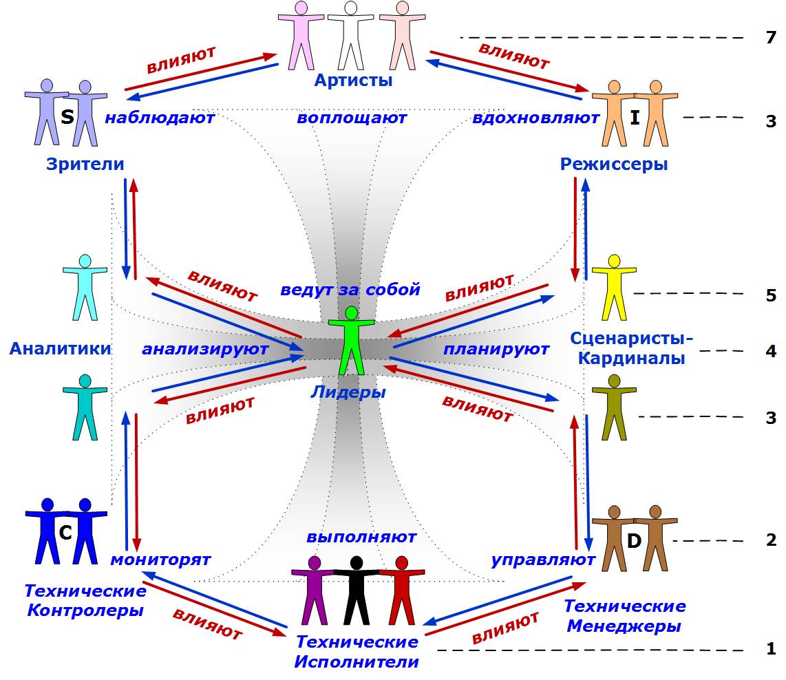 Первичен лидер (4). Он всегда один. При полном отсутствии команды он сам в состоянии, надевая разные шляпы, входить последовательно во все одиннадцать образов. Второй шаг разделения состоит в появлении у лидера двух видов исполнителей по вертикали (1 и 7) – «технических исполнителей» и «артистов реализаторов». На третьем шаге, у лидера появляются члены команды, отдельно отвечающие за операции (слева) и за развитие (справа). Двойной цикл PDCA начинает работать. На четвертом шаге, появляются менеджерские команды по диагоналям (2 и 3). Это и есть четыре базовых психотипа – пары флегматики-сангвиники (на рациональном уровне 2) и меланхолики-холерики (на чувственном уровне 6). На пятом шаге, Аналитики и сценаристы, не в силах удержать сложность и объем бизнеса специализируются отдельно – на инфраструктуре и бизнесе с клиентами (3 и 5). Умение держать одновременно в поле зрения и бизнес и инфраструктуру, глубоко занимаясь или поддержкой, или развитием бизнеса – большое искусство и большая проблема любой организации.