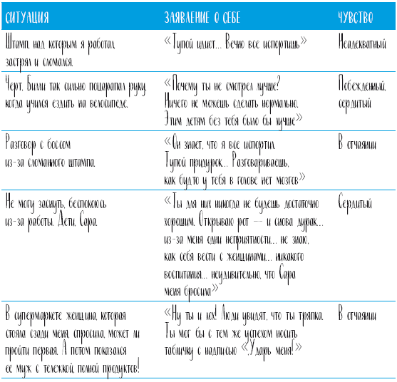 Сначала это будет непросто. Очень трудно поймать себя в момент, когда в голове кишат негативные мысли. Такие мысли могут быть настолько укоренившимися, что придется приложить значительные усилия, чтобы отсортировать их от другого фонового шума в вашей жизни. Также многим людям сложно отделить мысли от чувств. Далее в этом разделе вы увидите на примере, что чувства обычно суммируются, выражаясь одним-двумя словами («некомпетентный», «неадекватный», проигравший»), а мысли более сложны, как фрагменты подслушанного диалога. Вместе взятые, ваши мысли составляют внутренний монолог. Они служат для подкрепления и утверждения ваших базовых убеждений.