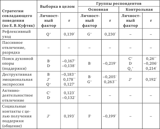 У респондентов контрольной группы копинг-стратегия деструктивной эмоциональной экспрессии тесно связана (r = 0,192*) только с высокими значениями фактора «J», который проявляется в выраженном индивидуализме, усталости от общения, замкнутости, обидчивости. Другой копинг-стратегией, имеющей значимую связь с набором личностных черт, выступает поиск духовной опоры. Эта стратегия коррелирует с факторами С+ (высокие значения – эмоциональная устойчивость) – r = 0,260*, D— (низкие значения – эмоциональная уравновешенность, сдержанность) – r = –0,206* и Q+3 (высокие значения – социальность) r = 0,214*. На основании обнаруженной связи можно утверждать, что поиск духовной опоры для детей контрольной группы связан не с состоянием их отчаянного поиска спасения (как в основной группе), а с ощущением эмоциональной стабильности, трезвым взглядом на происходящее, уравновешенностью и сдержанностью, чувством «защищенного тыла», сохранением самоуважения и самоконтроля, со стремлением к самоорганизации. Обращение к стратегии поиска духовной опоры детей контрольной группы основывается, скорее, не на вере в чудеса (как у детей основной группы), а на возможности остановиться, сконцентрироваться и поразмыслить над происходящим, чтобы эффективно направить свою энергию на разрешение фрустрирующей ситуации.