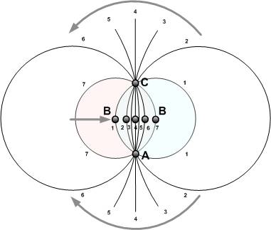 Чтобы ощутить единство минус бесконечности и плюс бесконечности, можете поставить простой компьютерный эксперимент. Мы все знаем, что через 3 точки приходит одна и только одна единственная окружность. Прекрасно! Возьмите любую компьютерной графическую оболочку, например, MS Visio (там есть такой объект) и попробуйте разместить три точки A, B, C не на одной линии (Рис. Положение окружности 1). Теперь плавно, не спеша, слева направо перемещаем одну из точек (точку B) между двумя другими (точками А и С). Вы визуально обнаружите, что маленькая окружность быстро превращается в большую и очень большую (1,2,3), а потом резко меняет расположение, появляясь с противоположность стороны (5,6,7).