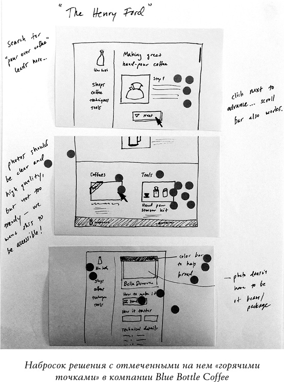 Но везде есть свои недостатки. Так, из карты «горячих точек» не ясно, почему людям понравилась та или иная идея; а если вы не понимаете, в чем состояло намерение автора наброска, то карта не сможет его вам объяснить. Так что возникает необходимость дополнительно обсудить наброски вместе с командой. Конечно, для этого придется разговаривать, а мы старательно избегали разговоров, начиная с утра вторника. Надеюсь, вы еще не забыли, как это делается.