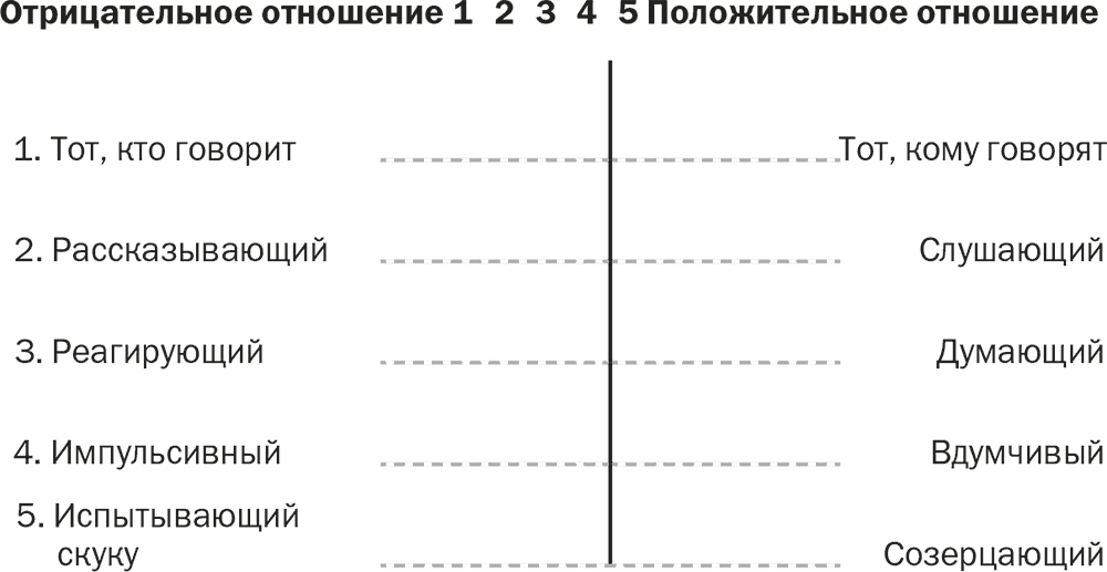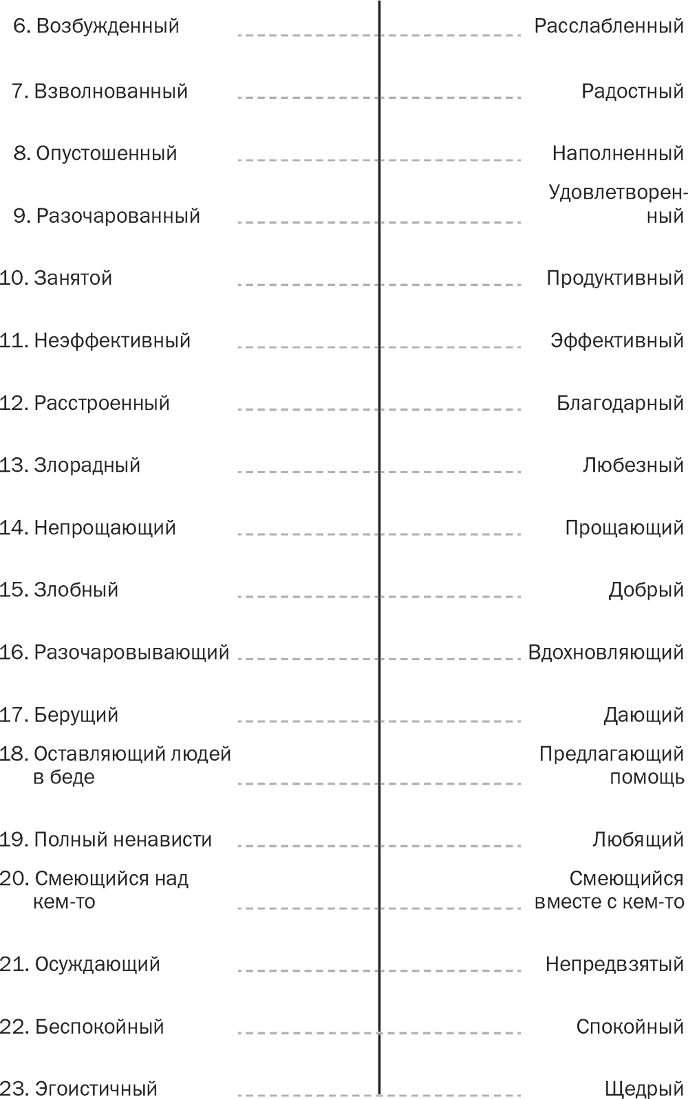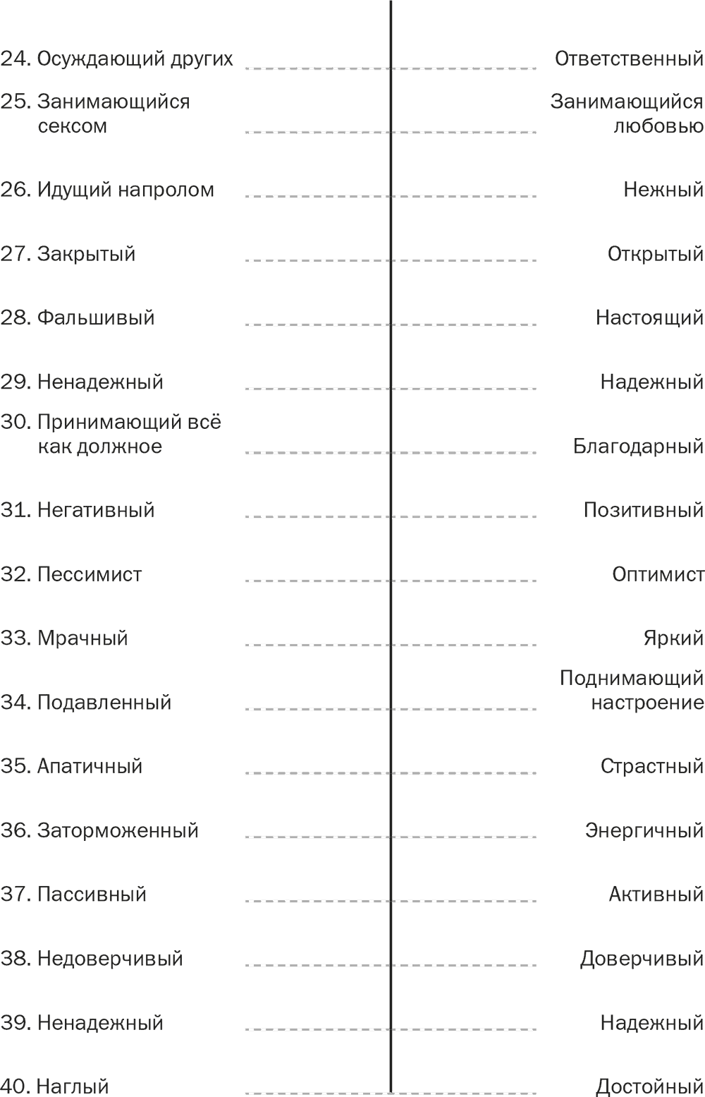 Какими вы обычно видите мир и людей вокруг вас? Возьмите листок бумаги и выпишите в столбик числа от 1 до 40 (или скопируйте страницу с этим упражнением). Оцените людей из вашего окружения по предложенным парам признаков. Вы можете поставить каждому признаку оценку от единицы до пятерки. Если хотите, сделайте это упражнение отдельно для родственников, коллег и друзей.