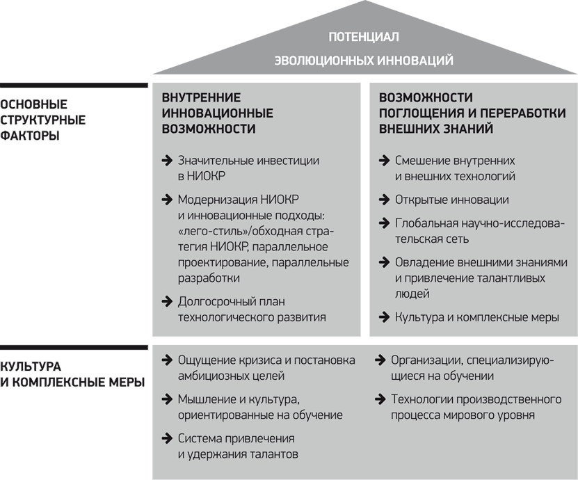 С тех пор как Samsung выросла в глобального лидера, она отдает первенство внутренним инновациям. Компания продолжает заимствовать внешние знания через свои зарубежные исследовательские институты и стремится к открытым инновациям. Но теперь – в первую очередь благодаря внутреннему потенциалу – Samsung сама развивает и совершенствует передовые технологии и создает новые категории продуктов. На рисунке 7.1 приведена структура потенциала эволюционных инноваций Samsung.