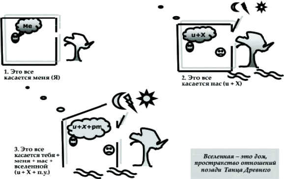 На второй картинке вверху справа окно более открыто, и вы можете видеть дерево и другие вещи. Теперь в комнате есть второй человек. Это второй аспект большой картины: «Это все касается нас». Вы можете подумать, что переход от первой картины ко второй должен быть легким, но идея нас означает, что это не я и это не вы. Вместо этого есть «нашесть», на которой нам нужно сосредоточиваться, пространство между нами, поле – что до сих пор является необычной системой отсчета для большинства людей. Да, это выглядит так, будто в один момент проблема в вас, а в другой момент проблема во мне, но по существу имеется поле между нами. Это касается нас и нашей общности.