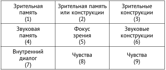 Бессознательные движения глазных яблок можно условно ограничить девятью зонами. Каждая из зрительных зон соответствует тому, какая система восприятия и мышления действует в данный момент (см. таблицу 3).