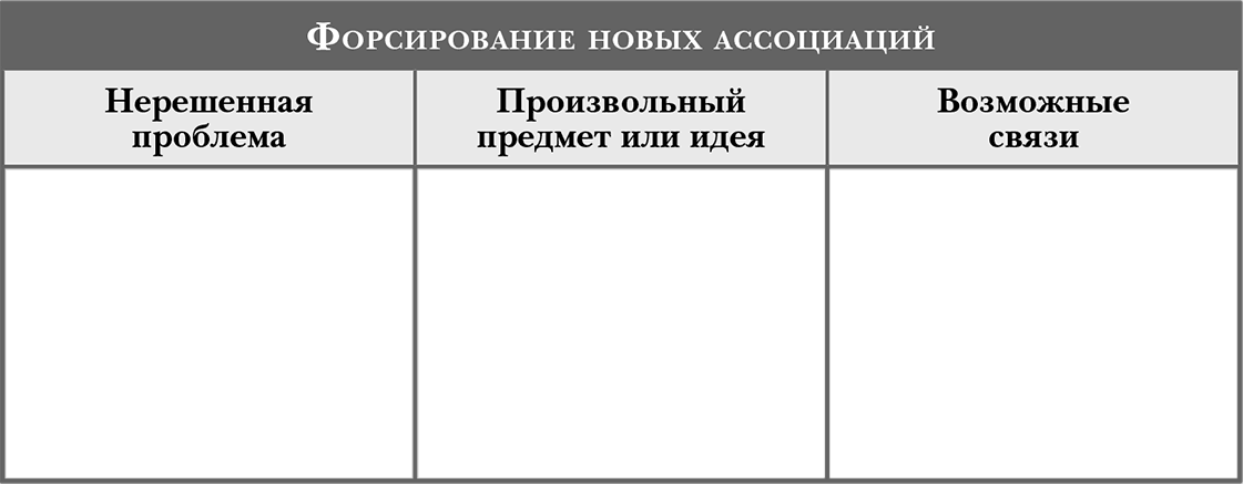 Для применения форсированных ассоциаций сначала рассмотрите проблему или задачу, которая стоит перед вашей компанией. Затем попробуйте следующее упражнение, чтобы сконструировать ассоциации, которые в обычной ситуации вы не проследили бы: