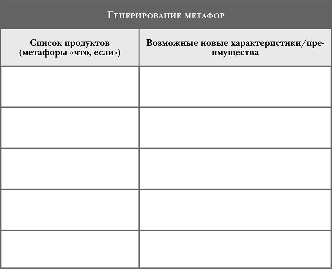Вернемся к той задаче, которую решает ваша компания. Попробуйте выполнить одно из этих упражнений на форсированные ассоциации, выделите какой-то не имеющий к теме ваших поисков предмет или идею и не спеша обдумайте, как он (она) соотносятся с вашей проблемой.