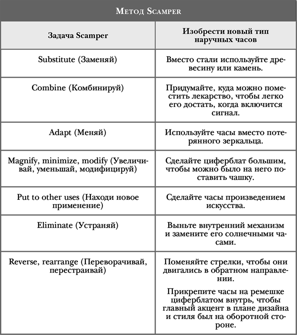 Попробуйте методику Алекса Осборна и Боба Эберле по формуле инсайта SCAMPER: заменяйте, комбинируйте, добавляйте; увеличивайте, уменьшайте, модифицируйте; находите новое применение; удаляйте; меняйте местами, переворачивайте. Используйте любую из этих концепций или все сразу, чтобы переосмыслить проблему или возможность, с которой вы работаете (это особенно полезно, когда вы рассматриваете варианты редизайна продукта, услуги или технологии). В книге Thinkertoys Майкла Микалко («Рисовый штурм и еще 21 способ мыслить нестандартно») можно узнать о методике SCAMPER подробнее. (См. табл. 2-3.)
