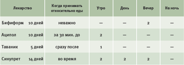 Для этого можно сделать специальную карточку, чтобы понимать, какое лекарство когда пить (табл. 9), а можно сразу же сделать график со столбцами, в которых вы или ребенок в ваше отсутствие отмечает факт приема лекарства.