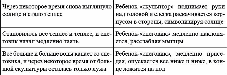 Дети разбиваются на пары. Один из детей «лепит снеговика» из своего партнера в соответствии с рассказом тренера.