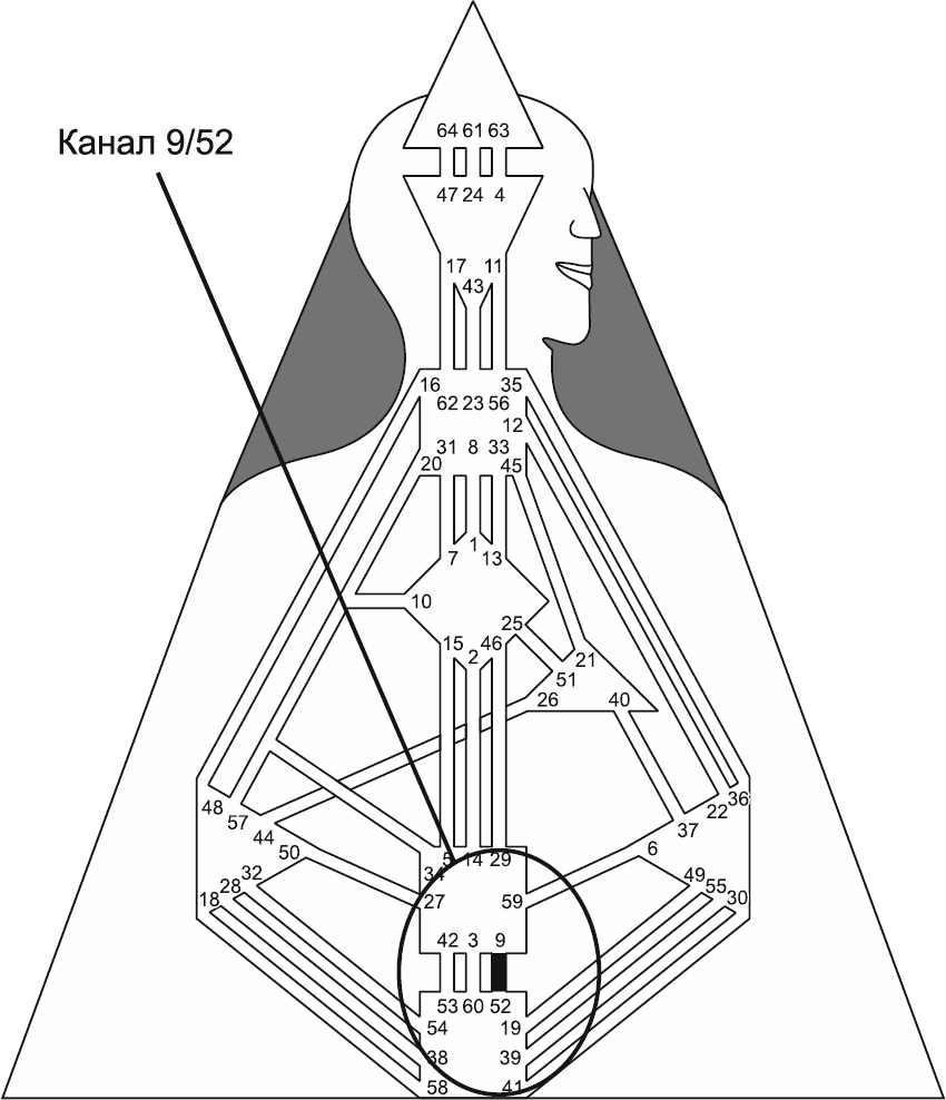 Канал 9/52 дает начало потоку энергии из центра Карты жизни. Контур развивается. Логические предпосылки подтвердились, и теперь нужно формализовать идею при помощи энергии жизненной силы (которая движется от Сакрала к Горлу). Мы применяем новую концепцию к окружающему нас обществу. На этом этапе важно помнить, что внедрять стоит лишь доказанную гипотезу, а талант демонстрировать лишь тогда, когда он отшлифован длительными тренировками.