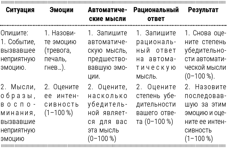Существенной частью терапии является ведение «Протокола дисфункциональных мыслей». Поначалу пациент заполняет только первые три колонки протокола, в которых регистрируются ситуации, вызвавшие негативные эмоции, сами эмоции и автоматические мысли. Выполняя это задание, пациент учится отслеживать изменения в своем настроении, находить более точные обозначения для своих чувств и улавливать взаимосвязи между эмоциями и автоматическими мыслями. Овладение этими начальными навыками помогает ему найти рациональные ответы на дисфункциональные автоматические мысли, которые вносятся в четвертую колонку. В последней колонке оценивается результат работы.