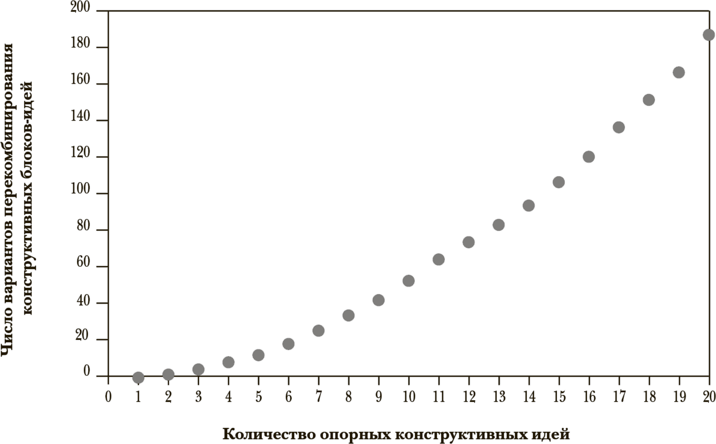 Концептуально, когда инноваторы увеличивают число конструктивных блоков-идей. Этим они значительно увеличивают количество новых вариантов их комбинаций, из которых может возникнуть что-то неожиданное. Возможность творчески соединять одно с другим (создавая необычные комбинации) зависит от того, сколько уникальных строительных блоков человек накопил в своей голове на предыдущих этапах[17].