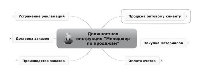 * При составлении ментальных карт по должностным инструкциям не по всем должностям вторым уровнем будут конкретные обязанности по ним. Так, в приводимом мной примере есть функция «оформление заказов». Она достаточно очевидна и не содержит в себе ряд подфункций. Поэтому в данном случае вторым уровнем будет пошаговая инструкция.