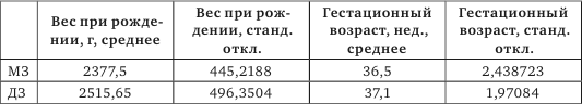 Основной используемый метод – структурированное наблюдение по разработанной схеме. Анализировались видеозаписи поведения близнецов в ситуации тестирования их интеллектуального и психомоторного развития. Сбор данных продолжается. На настоящий момент просмотрено 122 видеозаписи МЗ и 128 видеозаписей ДЗ близнецов в возрасте от 4 до 42 мес. Исследование лонгитюдное, т. е. одни и те же пары тестировались в возрасте 4, 8, 12, 18, 24, 30, 36 и 42 мес. Участвовали 10 пар МЗ и 10 пар ДЗ близнецов, к сожалению, не все пары удалось проследить во всех срезах. Характеристики веса и гестационного возраста детей представлены в таблице 1.