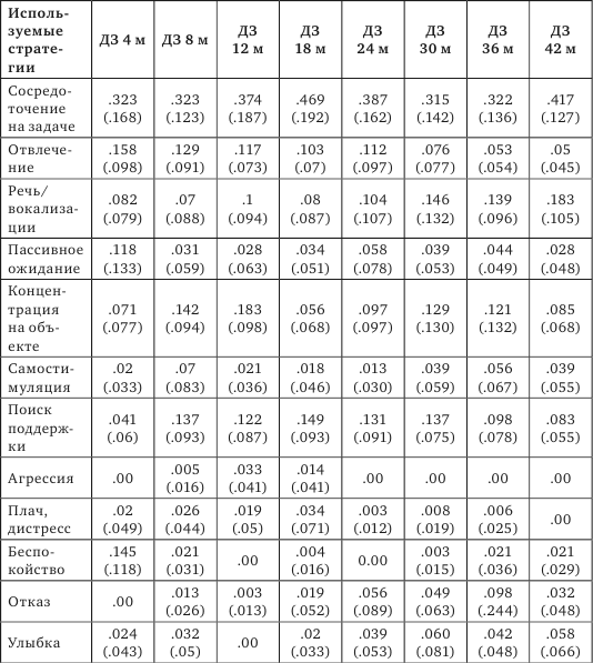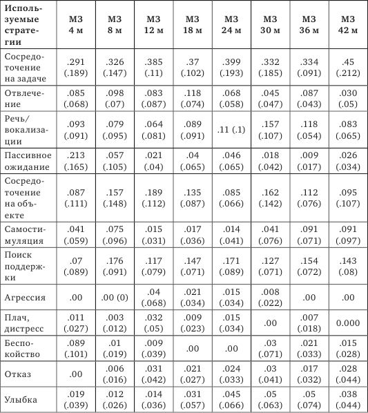 Возрастной динамики также практически не обнаруживается, частота употребления тех или иных видов стратегий преимущественно стабильна во времени. Наибольшие различия заметны в раннем возрасте (при переходе от 4 мес. к 8 мес. и от 8 мес. к 12 мес.) у МЗ и ДЗ по таким стратегиям, как поиск поддержки, пассивность, беспокойство, самостимуляция и отказ. При этом частота использования поиска поддержки увеличивается, а пассивности и двигательного беспокойства уменьшается. У самостимуляции наблюдается пик в 8 мес., затем она используется редко. Количество отказов также несколько увеличивается с возрастом. На уровне тенденции заметно уменьшение частоты отвлечения с возрастом (у МЗ значимые различия) и увеличения использования вокализаций/речи, причем переломной точкой является возраст 24 мес.