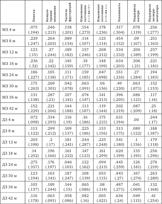 Значимые различия (по критерию Манна – Уитни, р < 0,05), наблюдаются между МЗ и ДЗ близнецами по поддержке матери – в 4 и 18 мес., по частоте фрустраций в 30 мес., по степени концентрации внимания и частоте ухудшения настроения в 42 мес. Следует отметить также, что взятые в целом выборки МЗ и ДЗ близнецов различаются по частоте поиска поддержки у взрослого и поддержке, оказываемой матерью. МЗ близнецы чаще ищут поддержку и чаще ее получают у матери. Поддержка матери у МЗ значимо увеличивается от 8 к 12 мес. и значимо уменьшается в период с 24 до 30 мес. Экспериментаторы тоже несколько чаще поддерживают МЗ близнецов, но здесь различия не значимы.