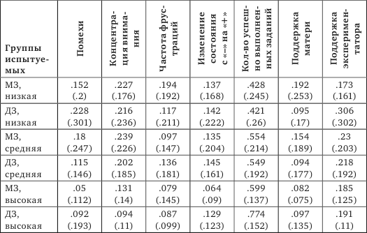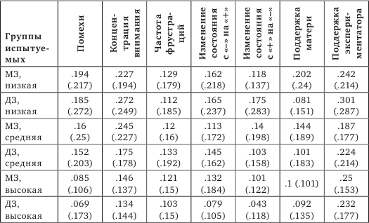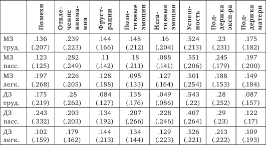 У ДЗ положительно связаны количество помех с нарушениями внимания (0,18). Так же, как и у МЗ близнецов, у них наблюдается положительная связь между частотами изменения настроения в положительную и отрицательную стороны (0,42) и количеством фрустраций (0,49), т. е. легче фрустрируются более эмоционально лабильные дети. Поддержка экспериментатора значимого влияния на успешность ситуативного контроля поведения не оказывает, а поддержка матери связана с нарушениями внимания (0,23), частотой фрустраций (0,21) и частотой улучшения настроения (0,30). У ДЗ есть связь между успешностью и частотой ухудшения настроения (–0,24), т. е. эмоциональным компонентом (корреляции r Спирмена, значимость p < 0,05).