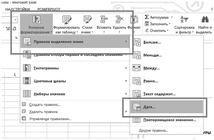 Выделяем ячейки с датами, выбираем «Условное форматирование» ? «Правила выделения ячеек» ? «Дата»: