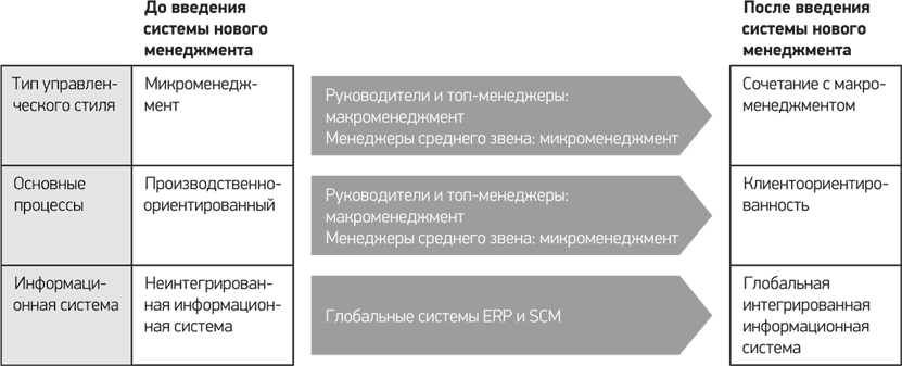 До введения «Новой управленческой инициативы» подход Samsung к управлению отличался вниманием к мелким деталям. Операционная эффективность при этом росла хоть и поступательно, но медленно. Однако единообразное применение такого подхода и к руководителям, и к рядовым сотрудникам может привести к тому, что бизнес потеряет свои позиции, утратит автономию и творческую направленность, а мотивация работников к изменениям сойдет на нет. Поэтому Ли Гонхи сместил фокус внимания компании с микроменеджмента к макроменеджменту, таким образом перей дя от повышения операционной эффективности к выполнению амбициозных стратегий (см. рисунок 4.4).