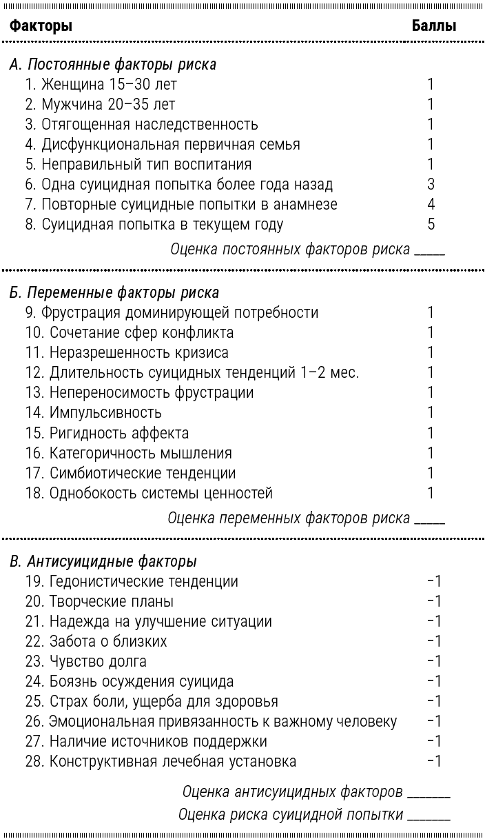 Во время суицидоопасного психологического кризиса личность становится ареной борьбы суицидогенных и антисуицидных факторов. Самыми частыми суицидогенными факторами являются потеря близкого человека, отвержение им, утрата здоровья и работоспособности, престижа и уважения окружающих. Им противостоят антисуицидные факторы: родительские чувства, нежелание причинять боль близким, выраженное чувство долга, страх боли и смерти, ее неэстетичность и инвалидность в случае неудачной попытки, боязнь осуждения, представление о неиспользованных жизненных возможностях, наличие творческих планов и замыслов, а также прошлые достижения в значимых для пациента областях. Оцените суицидный риск путем алгебраического сложения баллов (низкий суицидный риск – до 10 баллов, средний – от 10 до 15, высокий – более 15 баллов).