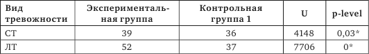Ситуативная (СТ) и личностная тревожность (ЛТ) в экспериментальной и контрольной группе 1 (медианы и показатели статистических различий)