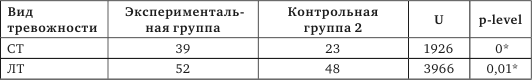 Ситуативная (СТ) и личностная тревожность (ЛТ) в экспериментальной и контрольной группе 2 (медианы и показатели статистических различий)