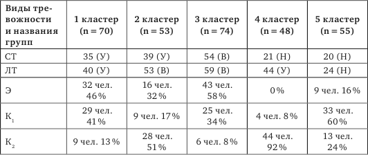 Наиболее информативным и дифференцированным оказалось разбиение выборки (n = 300) на пять кластеров. В таблице 3 выделены кластеры с медианными значениями по ситуативной и личностной тревожности и процент испытуемых экспериментальной и двух контрольных групп, входящих в каждый из пяти кластеров.