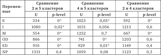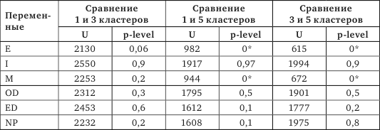 Для определения различий между пятью кластерами использовался однофакторный дисперсионный анализ Крускала – Уоллеса, который показал наличие различий между кластерами по пяти переменным: экстрапунитивным (Н = 55,86 при р = 0) и импунитивным реакциям (Н = 36,7 при р = 0), а также по типам реакций – с фиксацией на препятствии (Н = 32,1 при р = 0), с фиксацией на самозащите (Н = 9,3 при р = 0,05), с фиксацией на удовлетворении потребности (Н = 13, 84 при р = 0,01). Направленность различий определялась с помощью критерия Манна – Уитни. Учитывая тот факт, что испытуемые с наличием или отсутствием нарушения зрения были неравномерно распределены между пятью кластерами, мы сравнивали такие кластеры, которые являлись типичными для людей, дифференцированными по критерию здоровье/болезнь. Сравнение экспериментальной группы и контрольной группы 1 проводилось при сопоставлении первого, типичного для обеих групп, третьего, типичного для испытуемых со значительными нарушениями зрения и пятого кластеров, типичного для людей без снижения зрительной функции.