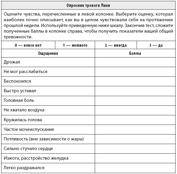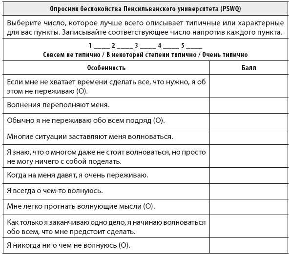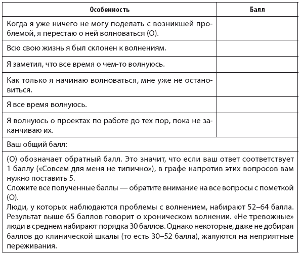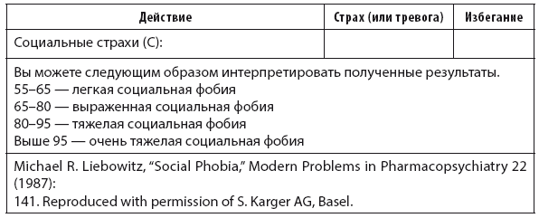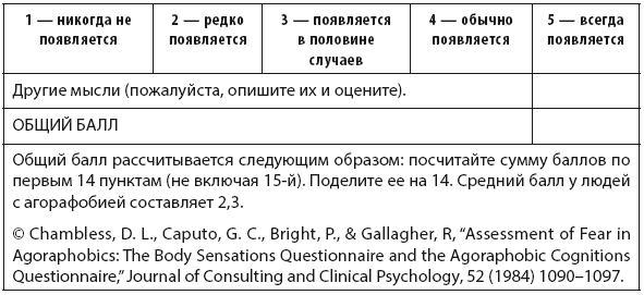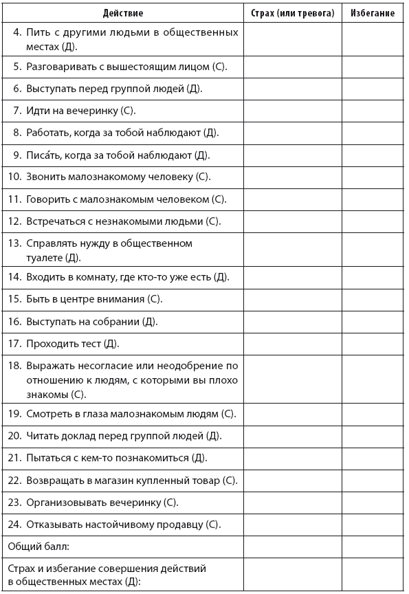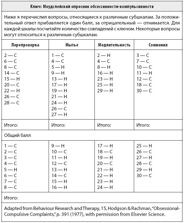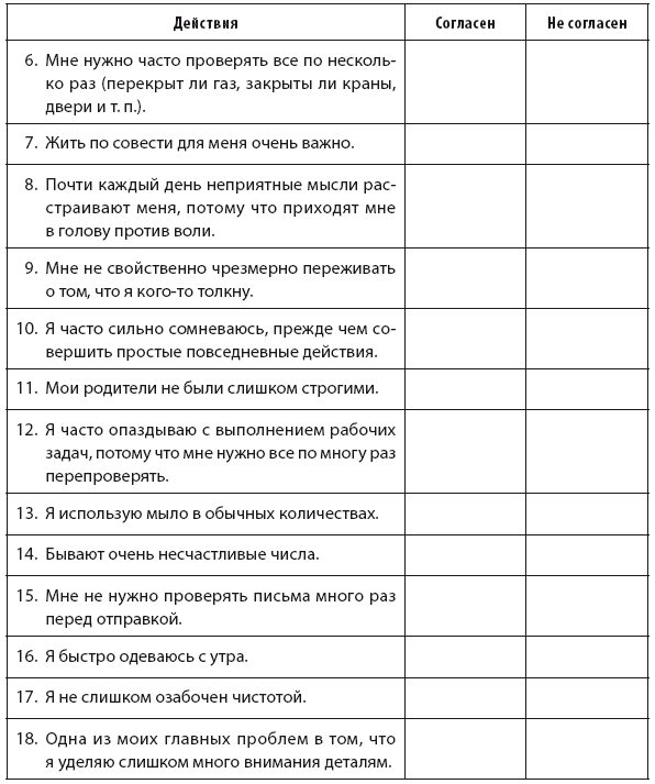 Вы можете не просто заполнить приведенную выше таблицу, но также обратить внимание на охваченные в ней склонности людей с ОКР: страх перед заражением, потерей контроля над собой (страх обидеть других или навредить им), болезнями, избыточные ритуалы, связанные с мытьем и едой, потребность содержать все в строгом порядке, повторять определенные действия, слова, мелодии или образы, которые против воли внедряются в сознание. Рекомендуется пройти этот тест еще раз по завершении прохождения программы самопомощи при ОКР.