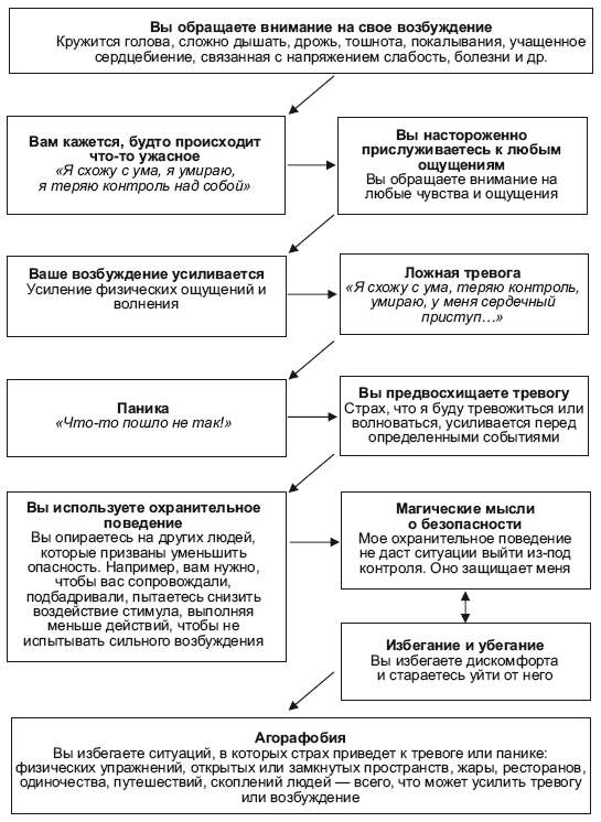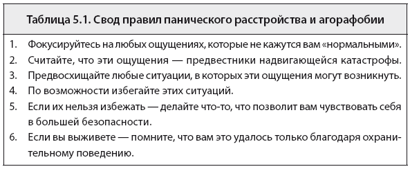 Ваши панические атаки и агорафобию не стоит считать неразрешимой тайной. Они всего лишь отражают правила, которыми вы руководствуетесь в жизни. Рассмотрите табл. 5.1 и следующую за ней схему 5.1 «Как развивается паническое расстройство и агорафобия», и все происходящее с вами обретет смысл. Агорафобия подчиняется определенному набору правил. Далее в этой главе мы рассмотрим, как переписать эти правила, чтобы панические атаки и агорафобия ушли из вашей жизни.