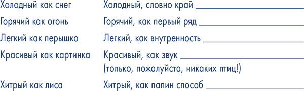 Клише – это образы, создаваемые с помощью слов, которые вы можете увидеть, услышать, попробовать на вкус, потрогать и почувствовать. Формулировки клише когда-то были забавными и необычными, но ими пользовались так часто, что они утратили всю свою силу воздействия на ваш слух и воображение. Клише – это сравнения, которые потеряли свою энергию и теперь делают вашу устную и письменную речь слабой и скучной. Пример: «Я трудилась как пчела и натерла себе трудовые мозоли, пока сажала растения в зимнем саду. Когда солнце село, я промерзла до костей и устала как собака». Прочитав два последних предложения, вы, наверное, уже зеваете (и это нормально!). Именно так работают клише – они вызывают у читателя скуку. Он начинает искать себе занятие поинтереснее. В его глазах тоска. Он включает радио. Он прибавляет звук. Ваша задача: возьмите воображаемые лук и стрелы и сбейте все клише, которые парят в воздухе и прячутся на странице.