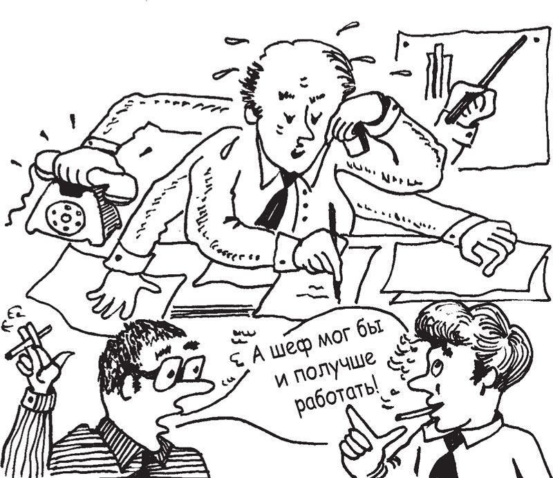 Когда говорят: «Босс не обучен», «Босс недальновиден» или «Босс все делает не так», ситуация всегда представляется вверх тормашками. Так как в первую очередь у перегруженного руководителя, находящегося в условиях стресса, не обучены помощники и непосредственные подчиненные.