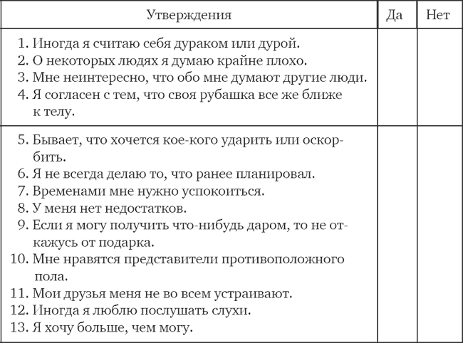 Ваша задача – внимательно прочитать каждое утверждение по порядку и выразить свое отношение к нему. Если Вы согласны с высказыванием, оно по отношению к Вам верно или в большей мере верно, чем неверно (так случается чаще), то Вы ставите напротив соответствующего номера в столбце с надписью «Да» галочку или крестик.