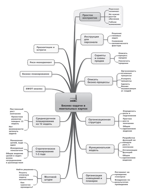 И это лишь малая часть того, как ментальные карты могут помочь вам сделать качественный скачок в бизнесе. Подробнее о перечисленных выше сферах использования ментальных карт, а также еще десяток направлений, где они сыграют вам добрую службу, вы прочтете в этой книге.