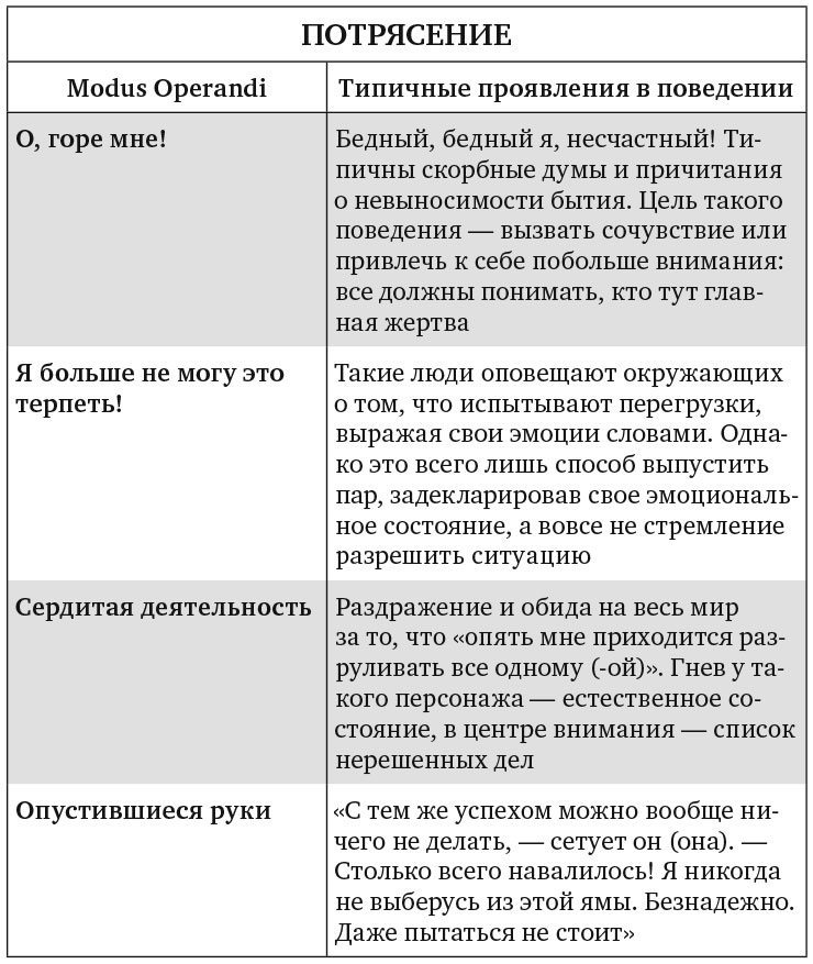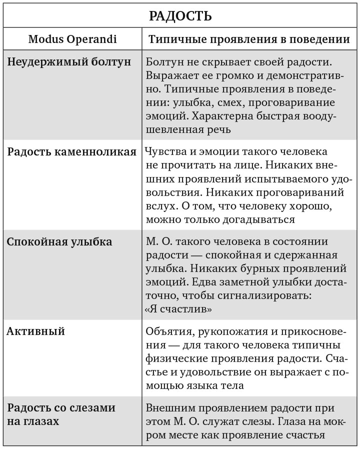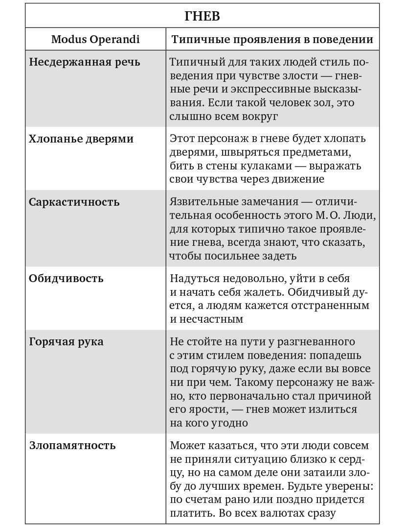 Одно из важнейших понятий в усвоении и интерпретации информации – modus operandi (M. O.), или стиль поведения. Смысл его в том, что у каждого человека есть свои поведенческие модели, повторяющиеся в похожих обстоятельствах. Криминалисты, например, умеют узнавать преступников по характерным для них действиям – поведенческим «отпечаткам пальцев». Внутренний наставник должен уметь выявлять такие «отпечатки» в вашем поведении. Что, к примеру, происходит, когда вы злитесь? Чаще всего ваши реакции идентичны или имеют общие черты. Такая предсказуемость будет помогать вам на пути развития ЭИ. К тому же информация о типичных для вас реакциях важна для банка данных, который будет вести внутренний наставник. На рисунке ниже перечислено несколько типичных стилей поведения для разных эмоций. Узнаёте ли вы себя в приведенных описаниях? Если нет, опишите собственный М. О. для тех эмоций, которые вы испытываете чаще всего. Спросите себя: «Что я делаю, когда испытываю то-то и то-то?» или «Как это ощущение влияет на мое поведение?» (см. рис. 9.1–9.5).