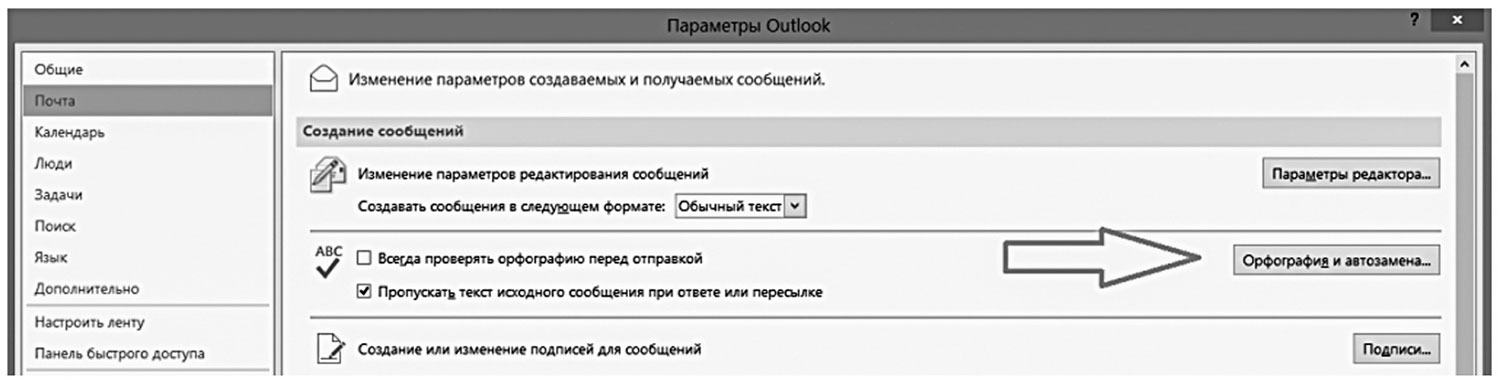 Для того чтобы настроить автозамену, откройте параметры Outlook, выберите раздел «Почта», нажмите на кнопку «Орфография и автозамена»:
