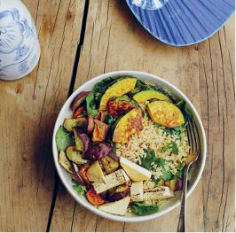 Добавьте приготовленный коричневый рис, вашу любимую зелень, запеченные кубики тыквы и кубики батата. Перемешайте, чтобы покрыть ингредиенты тонким слоем соуса. Добавьте кубики тофу и аккуратно перемешайте.