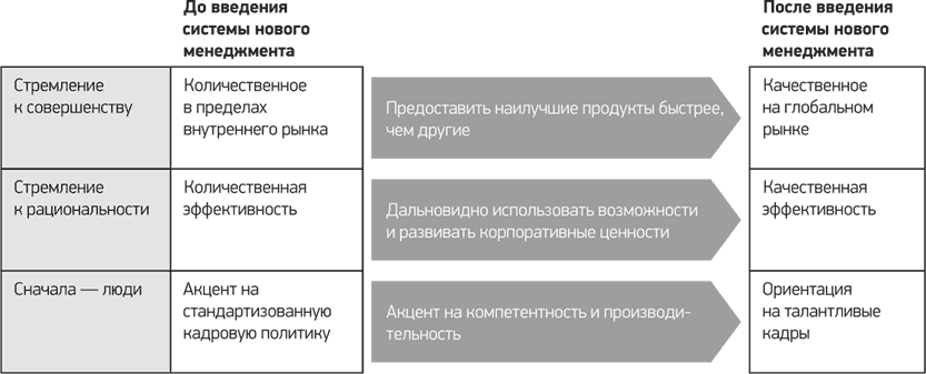 С момента основания Samsung менеджмент компании был сосредоточен на создании сильной корпоративной культуры, в которой главное место отводилось принципам «стремление к совершенству», «стремление к рациональности» и «сначала – люди». После появления «Новой управленческой инициативы» Samsung пришлось пересмотреть эти доминирующие ценности – они не соответствовали концептуальному видению, в соответствии с которым группа должна была превратиться в компанию мирового уровня путем качественного роста. В плане «стремления к совершенству» необходимо было добиваться не количественного роста, а максимального качества. Точно так же было необходимо трансформировать принцип «стремление к рациональности», где центральным элементом являлось понятие, означающее «количественная эффективность» (efciency). Теперь же требовалась «качественная эффективность» (efectiveness). Принцип «сначала – люди» тоже подвергся изменениям: вместо политики привлечения и воспитания сотрудников, соответствующих стандартным требованиям, компания принялась искать одаренных людей.