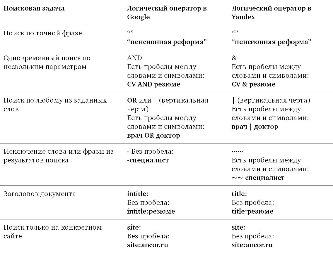 В таблице приведенной далее представлены наиболее распространенные логические операторы и техника их использования на примере поисковых систем Google и Yandex.