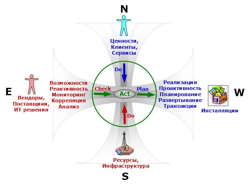В таком компасе просматриваются все четыре фазы PDCA (Plan, Do, Check, Act) любого бизнес-цикла. Обычная деятельность Do, исходящая от обоих полюсов вертикальной оси, является своего рода раздражителем, требующим реакции с противоположной стороны. Клиенты своей деятельностью влияют на инфраструктуру и наоборот, изменения инфраструктуры тут же, как в зеркале, сказываются на деятельности клиентов. Между раздражителем и реакцией, всегда должна быть пауза, во время которой проходит процесс в горизонтальном направлении оси: Check – понимание ситуации, сбор, обработка и анализ информации, рефлексия и накопление опыта, Plan– подготовка и исполнение ответной реакции.