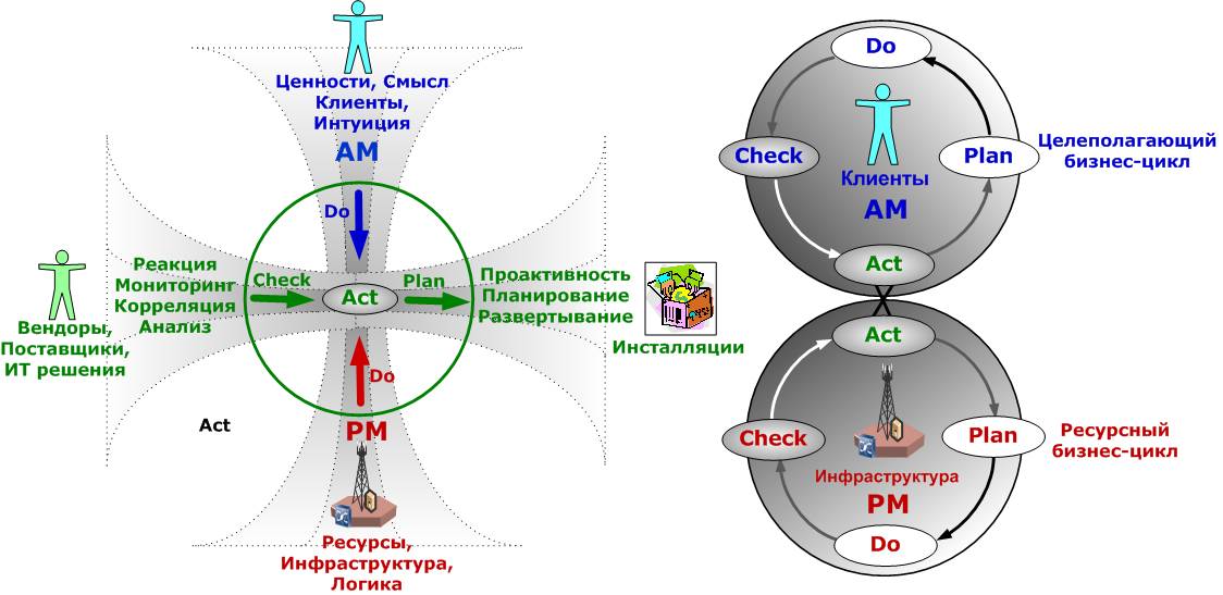 Любая бизнес-деятельность циклична и выполняется в два последовательных цикла: верхний (смысловой цикл) AM, направленный на клиентов, цели, ценности и смысл бизнеса, и нижний (ресурсный цикл) PM, направленный на обеспечение соответствия возможностей инфраструктуры целям бизнеса.
