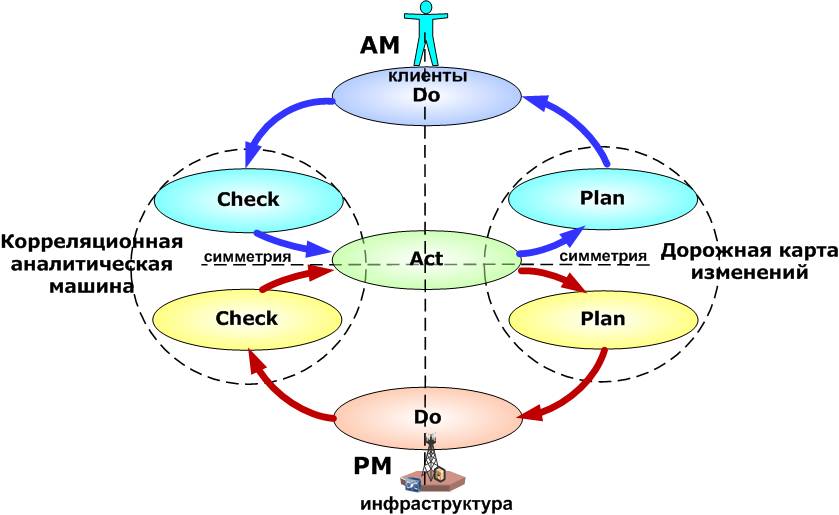 Теперь легко увидеть еще одну особенность. В обоих циклах фаза Check оказалась слева, а фаза Plan – справа. Здесь просто напрашивается объединение верхней и нижней фазы Check – в единую корреляционную аналитическую машину, а областей Plan – в единую машину планирования и развертывания с единой «дорожной картой».
