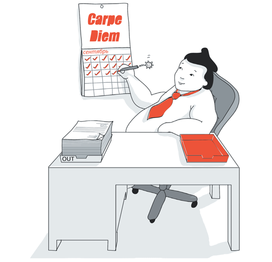Я слишком легко впадал в прокрастинацию, пока не посмотрел фильм «Общество мертвых поэтов». Из него я узнал отличное средство от лени. Робин Уильямс исполняет в фильме роль английского учителя в американской частной школе для мальчиков, и в одной сцене он знакомит юношей с латинской фразой. Он хочет вдохновить их, чтобы они начали ценить жизнь, и потому учит их фразе carpe diem. В упрощенном переводе она означает «лови момент». Меня так вдохновил этот фильм, что я сделал плакат с надписью «Carpe diem, лови момент» и повесил его на стене своего кабинета (Боб с Линдой не возражали).