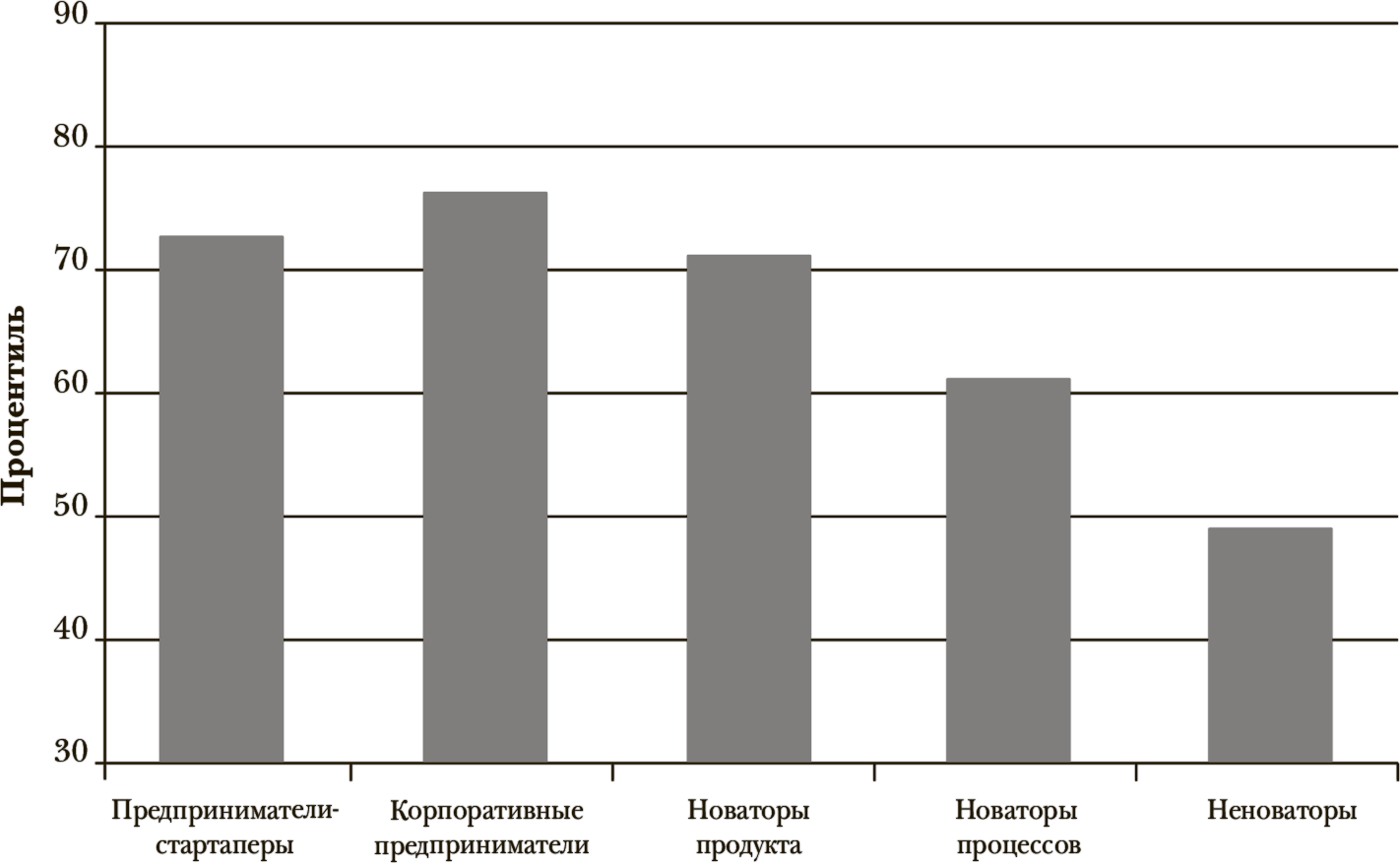 Некоторые из вас, возможно, думают: «С нетворкингом у меня все хорошо. Но я не мастер инноваций». И это вполне может быть так. Но, скорее всего, дело в том, что вы, как и большинство успешных управленцев, занимаетесь ресурсным нетворкингом, а не идейным. Большинство руководителей разного уровня строят и поддерживают контакты, чтобы продавать себя и свои компании или выстраивать отношения с теми, у кого есть необходимый для них ресурс. В отличие от управленцев, инноваторы реже нацелены на ресурсы или продвижение в карьере; скорее, общаясь с людьми самых разных взглядов, они активно используют новые мысли и идеи. (См. рис. 5-1.) Наше исследование показало, что предприниматели, как в стартапах, так и в корпоративном сегменте, владеют инструментами нетворинга немного лучше, чем продуктовые инноваторы, и значительно опережают новаторов процесса и неинноваторов. Если вы хотите запустить инновационное предприятие, навыки нетворкинга будут иметь огромное значение не только для генерирования новых идей, но и для мобилизации ресурсов, необходимых на старте новых проектов. В целом инноваторы попадают примерно в 77-й процентиль, тогда как неинноваторы показывают результат в области 47-го процентиля. (См. рис. 5-2).