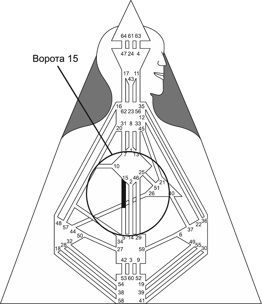 Ворота 15 обладают сильной и многогранной энергией (рис. 65). Ворота крайностей отмечают пики и провалы на синусоиде жизни. Обладатели Ворот 15 постоянно стремятся найти свой ритм, но он ускользает от них. Когда такой человек волевым усилием начинает придерживаться постоянного ритма, возникает разрушительный для отношений диссонанс, особенно если у его партнера открыты Ворота 5.