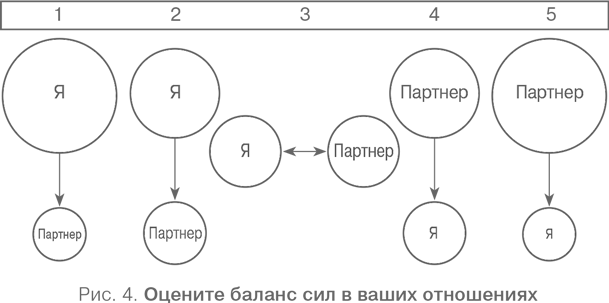 Затем вас просят оценить собственные отношения. Если вы считаете, что вы безусловный лидер, то вам подходит схема 1. Схема 2 тоже отражает ваше лидерство, хотя и не такое абсолютное. На схеме 3 мы видим полное равенство. Если же вы считаете, что в отношениях лидирует партнер, а вы ведомый, вам подойдут схемы 4 или 5. Нефф и Суиццо обнаружили, что те, кто считал себя ведомым, куда чаще признавали, что временами ведут себя неискренне в общении с партнером или что им сложно быть собой рядом с ним.