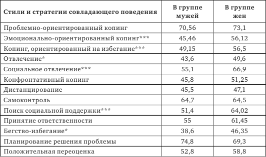 Жены на данном этапе семейного развития чаще, чем мужья, выбирают стратегии эмоционально-ориентированного копинга, отвлечения, поиска социальной поддержки, копинга, ориентированного на избегание, социального отвлечения и бегства-избегания.
