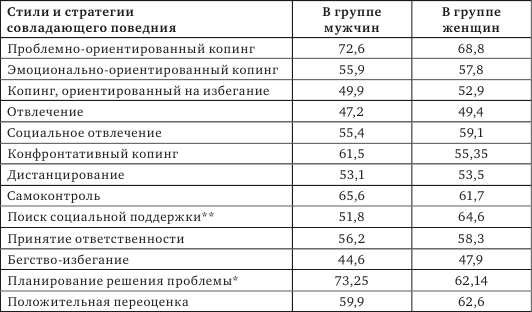 В целом выявленная нами специфика совладающего поведения супругов на данном этапе семейного развития свидетельствует о том, что зрелые супруги с возникающими трудностями совладают, чаще используя продуктивные и активные способы преодоления нагрузок в сочетании с поиском социальной поддержки.