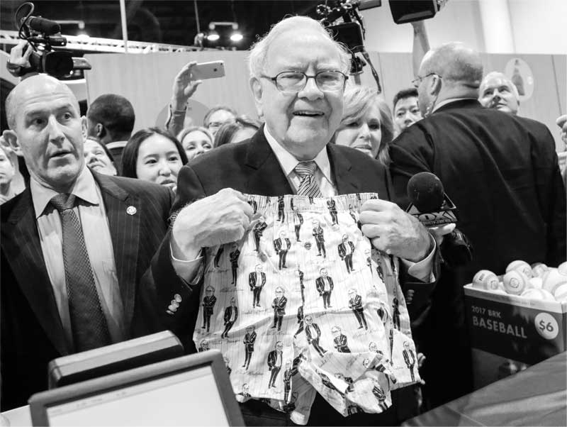 Уоррен Баффетт в выставочном зале CenturyLink Center в Омахе, «примеряет» шорты Berky, сделанные одной из принадлежащих его холдингу компаний. 6 мая 2017 г.